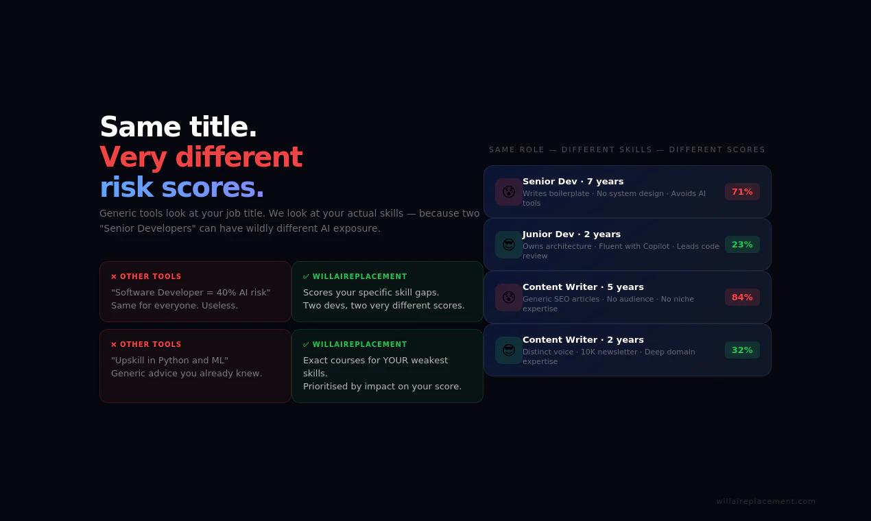 Most AI job risk tools just look at your job title. willaireplacement.com is different — it scores your risk based on YOUR specific skill gaps across 51 occupations. Rate yourself on 6-9 skills for your role, get a personalised risk score, and receive a survival plan with exact courses to future-proof your career. Free to use. No signup required.