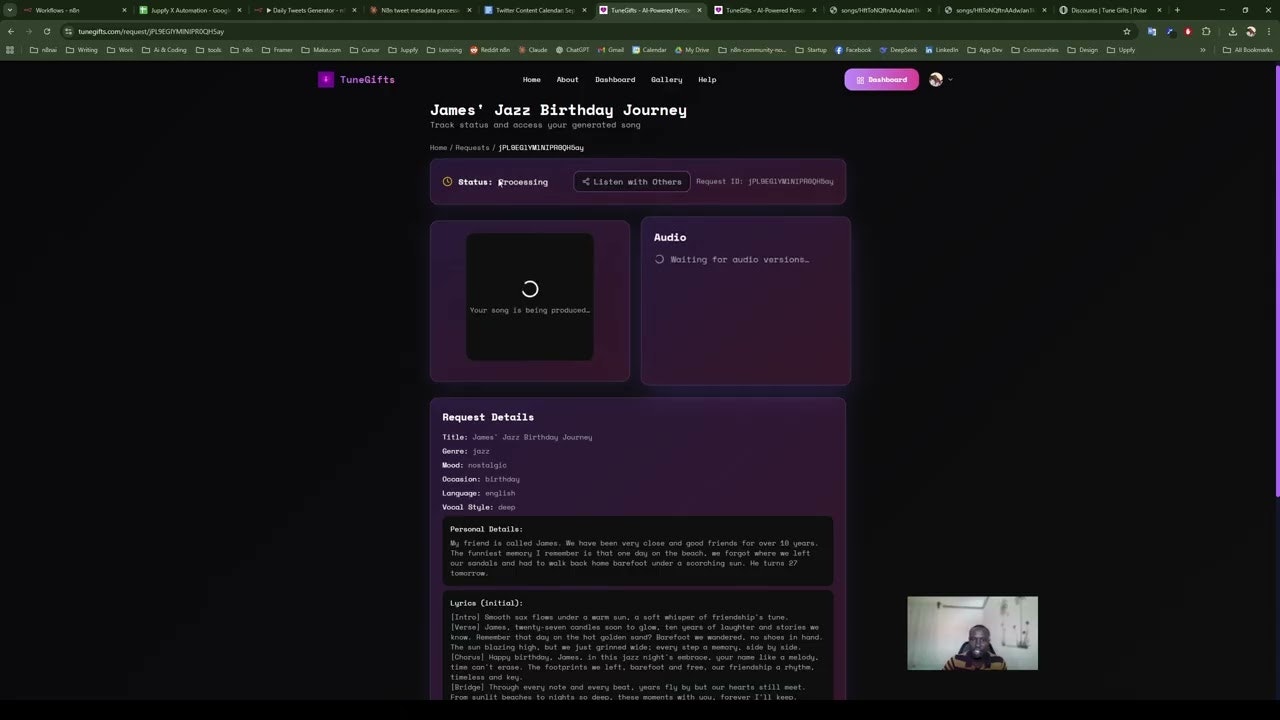 ## TuneGiftsの概要 TuneGiftsは、感情を瞬間に音楽に変えることができるユニークなサービスです。特別な人のための個別化されたAI生成の曲を、わずか4.99ドルで作成できます。誕...