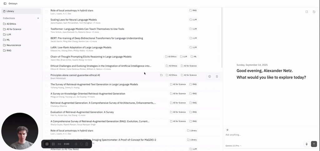 ## プロダクト概要 Ontosynは、研究論文を管理するための新しい手法を提供するAIワークスペースです。 ## 主な機能 - **クリーンなUI/UX**: スムーズな論文内ナビゲーショ...