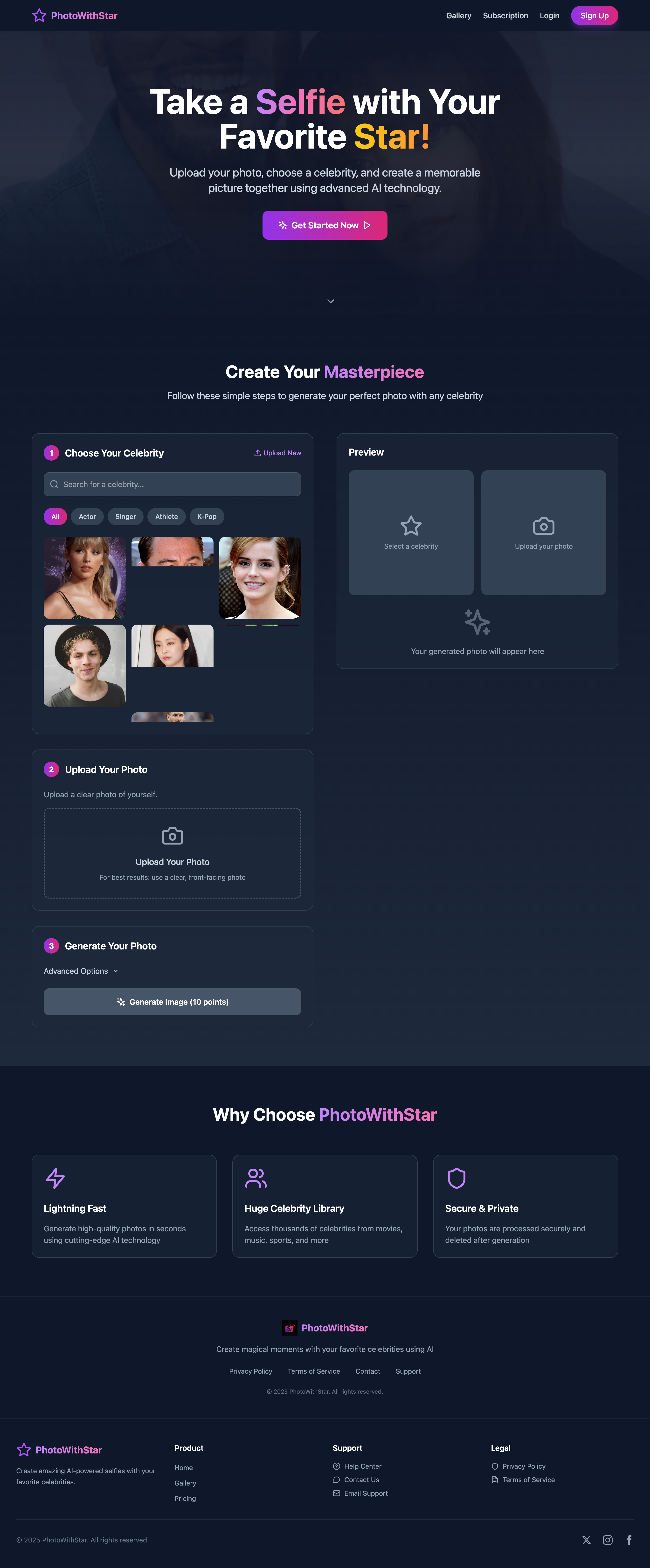 ## 概要 PhotoWithStarは、最新のAI技術を駆使して、ユーザーが好きなセレブリティとリアルな自撮りを作成できるプラットフォームです。自分の写真をアップロードし、20人以上の人気セレ...