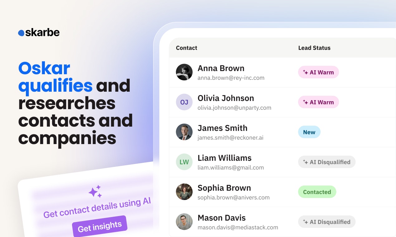 ## 製品概要 Skarbe内のAIエージェント“オスカー”は、見込み客の適格化・自動フォロー・データ補完・商談追跡を一手に担い、営業タスクの負担を軽減します。創業者や小規模ビジネスの人たちは“...