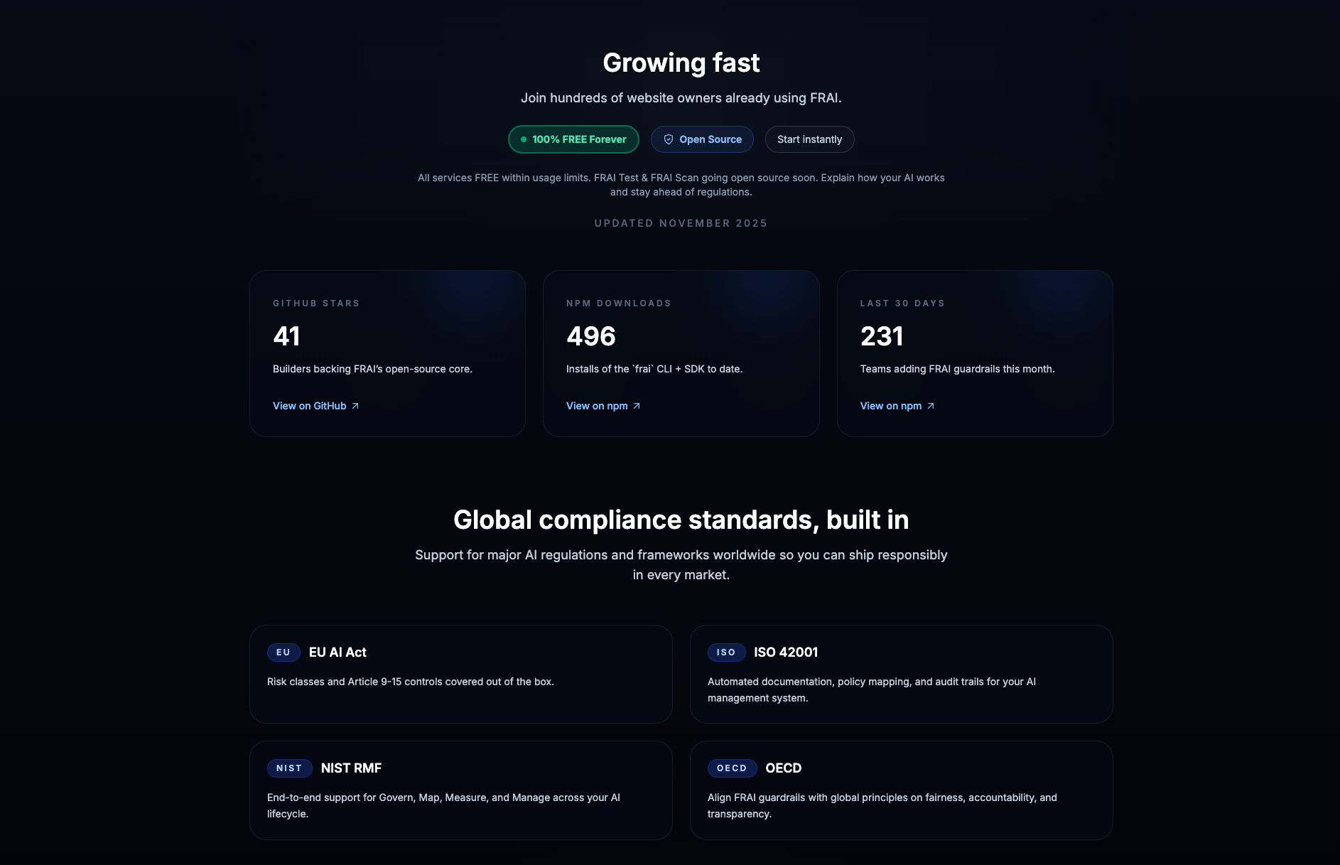 ## 概要 FRAIは責任ある人工知能の実践を支援するプラットフォーム。ウェブサイトのAI利用を自動スキャンし、チャットボットの偏り・安全性を検証。EU AI ActとISO 42001への準拠...