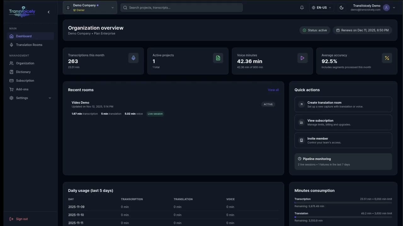 TransVoicelyは、AIを活用したエンドツーエンドのオーディオパイプラインを提供するプラットフォームです。リアルタイムでの音声キャプチャ・文字起こし・翻訳・音声合成・配信を、低遅延で実現...