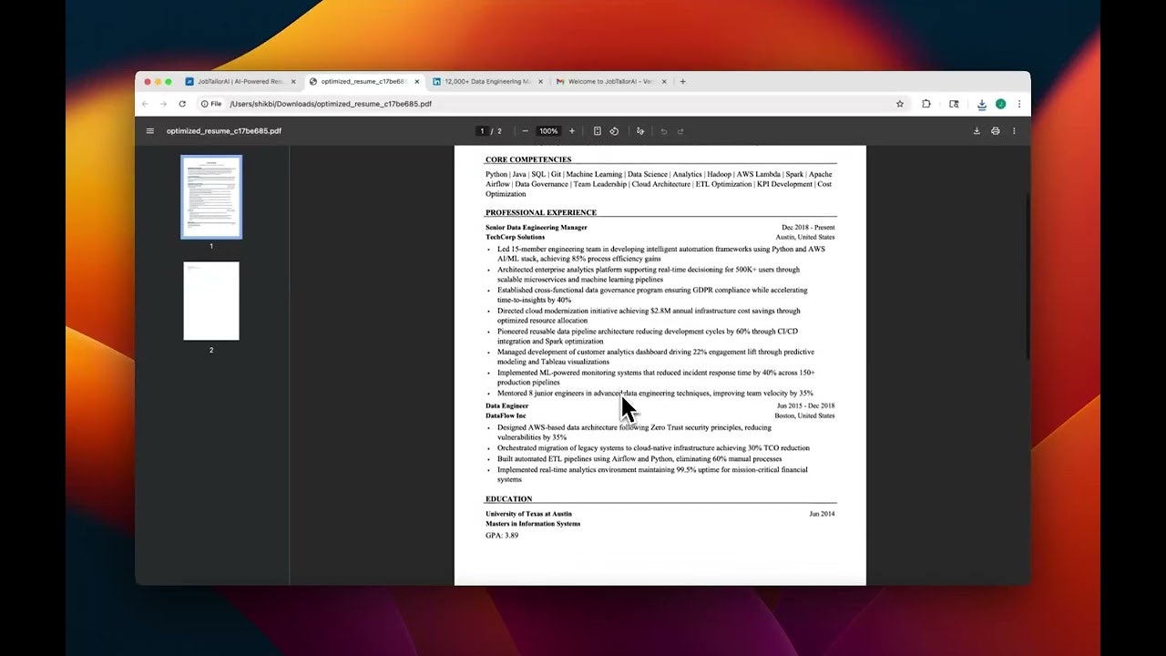 ## 概要 JobTailorAIは、経験を最適に伝え、1分未満で履歴書を職務適合させるAIツールです。虚偽は使わず、URLと履歴書のアップロードで求人に合わせて背景を調整します。カバーレターは...