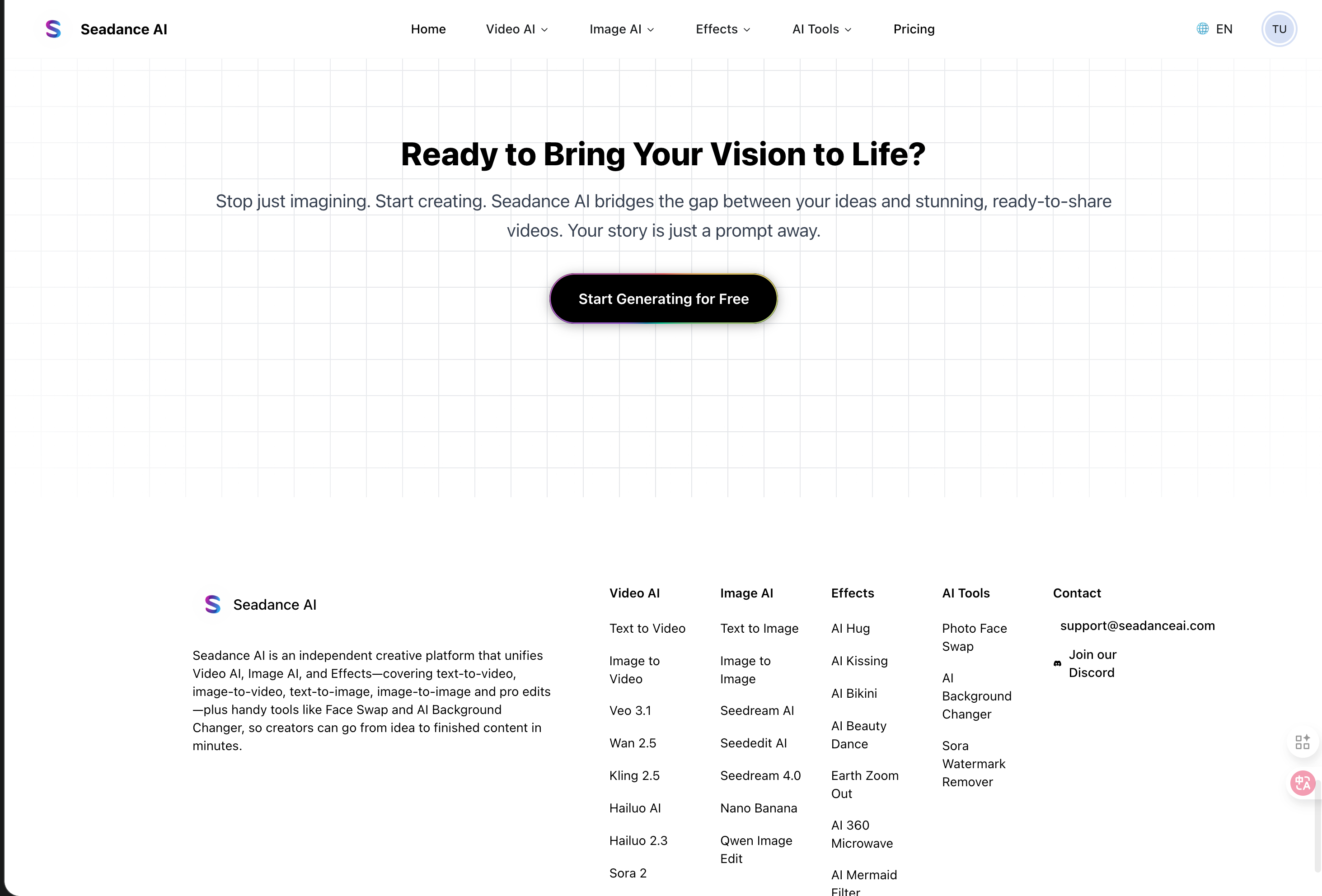 Seadance AI は、複数の AI 動画・画像モデルを1つのプラットフォームで利用できるオールインワンのクリエイティブツールです。テキスト・画像から動画を生成し、Seedream 4.0/...