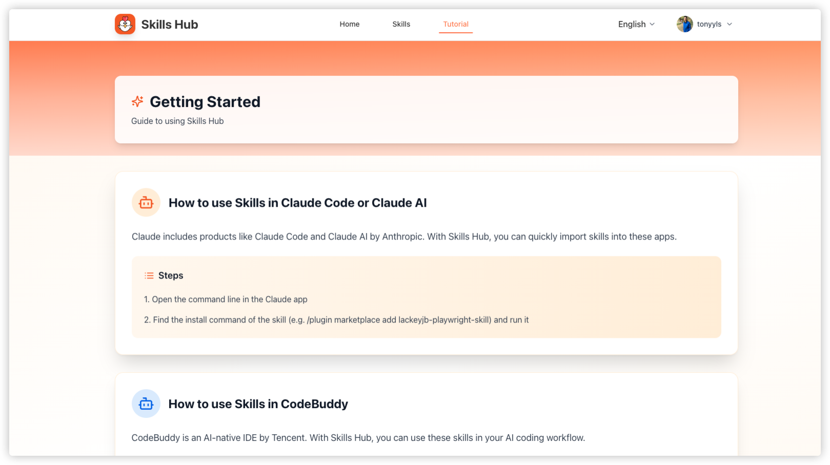 ## 概要 Skills Hubは、 ClaudeやCodeBuddyなどのツールを横断して、厳選されたAIスキルのライブラリを提供します。発見・インストール・管理を一元化し、AIワークフローの...