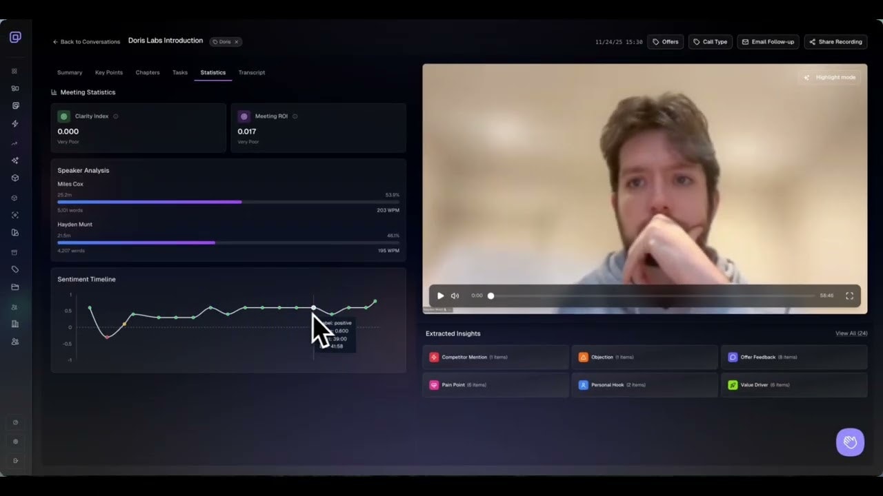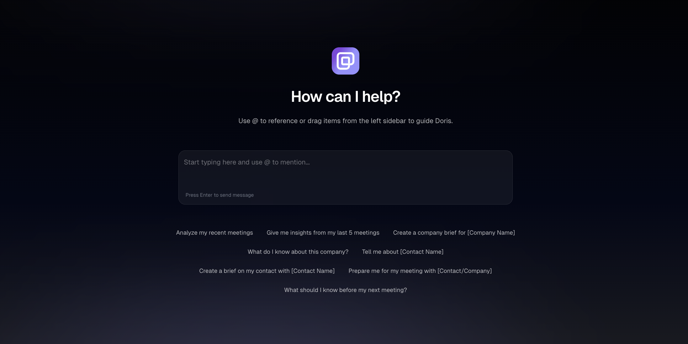 ## 概要 Dorisは顧客会話を分析して必要な洞察をタイムリーに関係者へ届けるインテリジェンス層です。会話の要約だけでなく、反論・価値・競合・顧客背景を可視化します。 ## 主要機能 - 会...