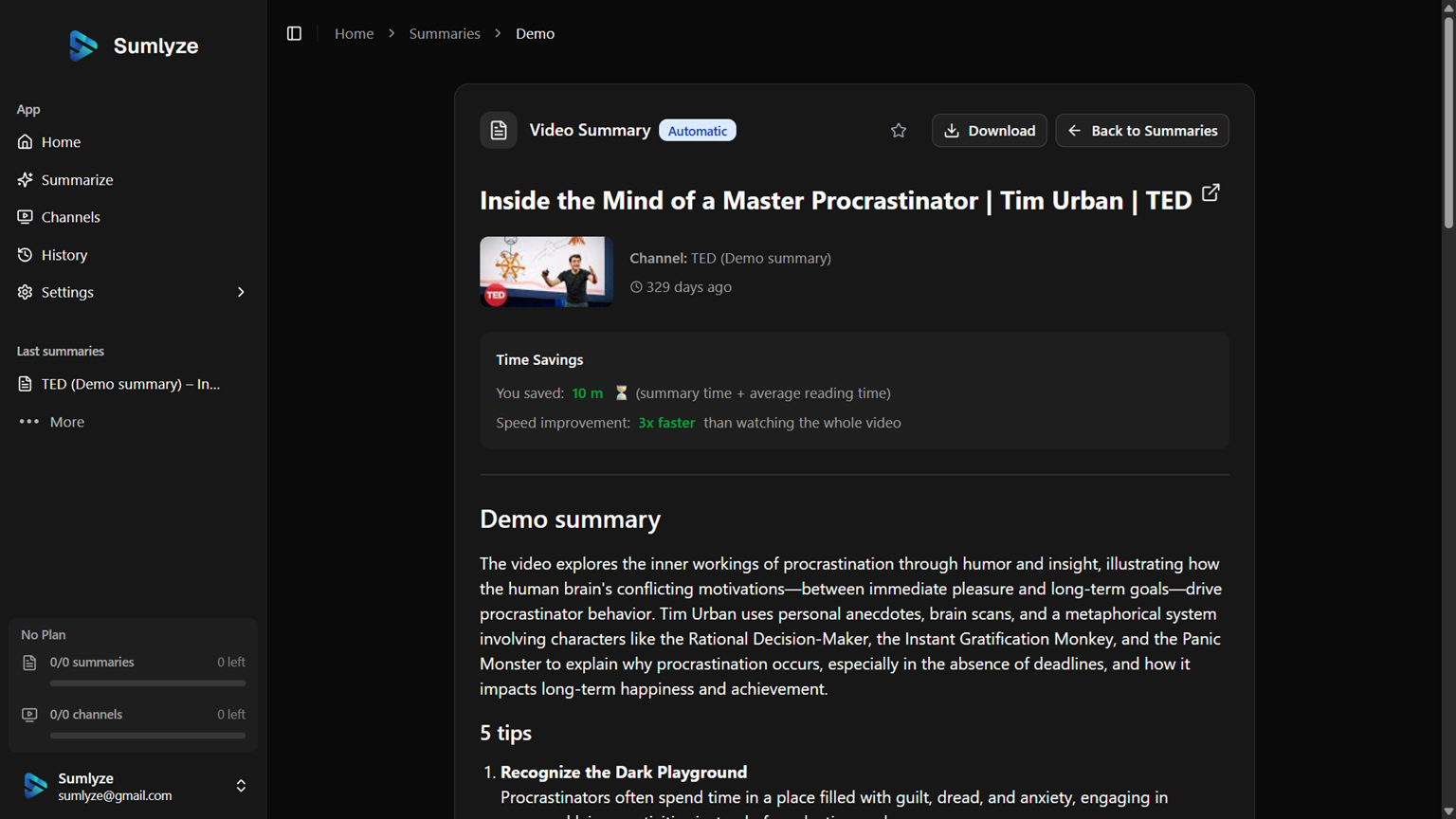 SumlyzeはYouTube動画を自動で要約する日次要約ツール。自動要約と任意URLの手動要約、履歴管理、Notionへのエクスポート機能を提供。5日間無料トライアルあり。