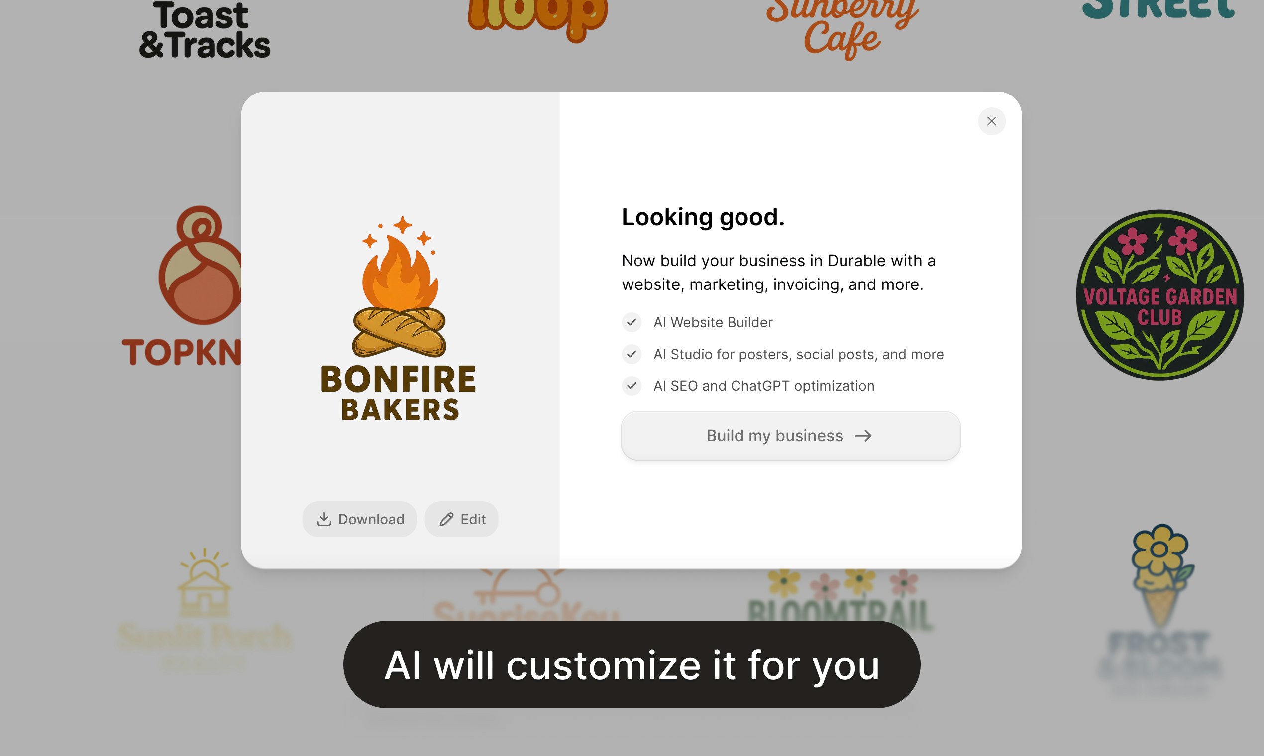 ## 概要 DurableのAIロゴジェネレーターは、ビジネス名とスタイルの好みを入力するだけで、すぐにデザイナー品質のロゴを生成します。毎週新しいスタイルが追加され、無限に近い組み合わせが可能...