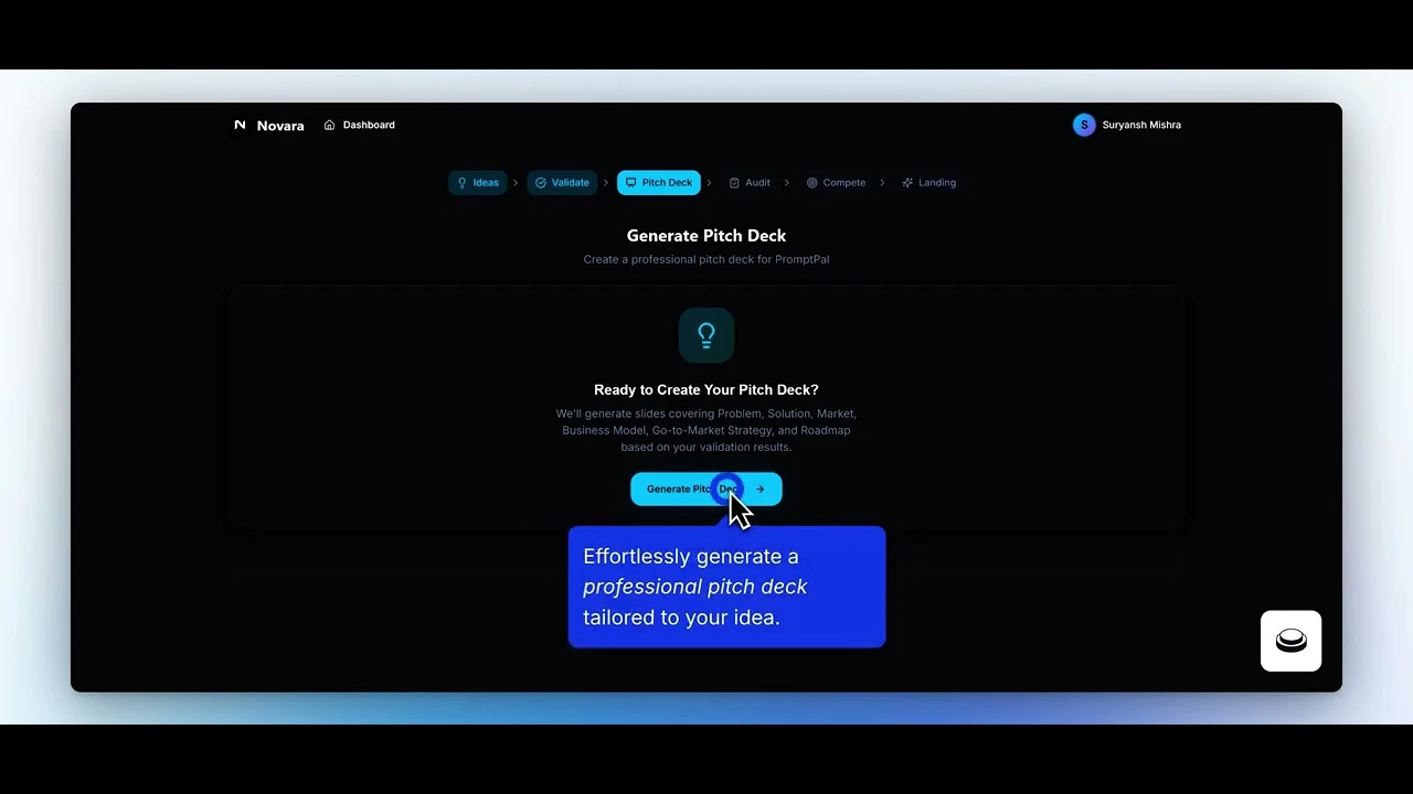 ## 本製品の概要 - AI搭載の統合プラットフォームで、創業者がアイデアを作成・検証・分析するプロセスを1か所で完結させる。市場検証、ピッチデック作成、スタートアップ監査を含む全工程を迅速に処...