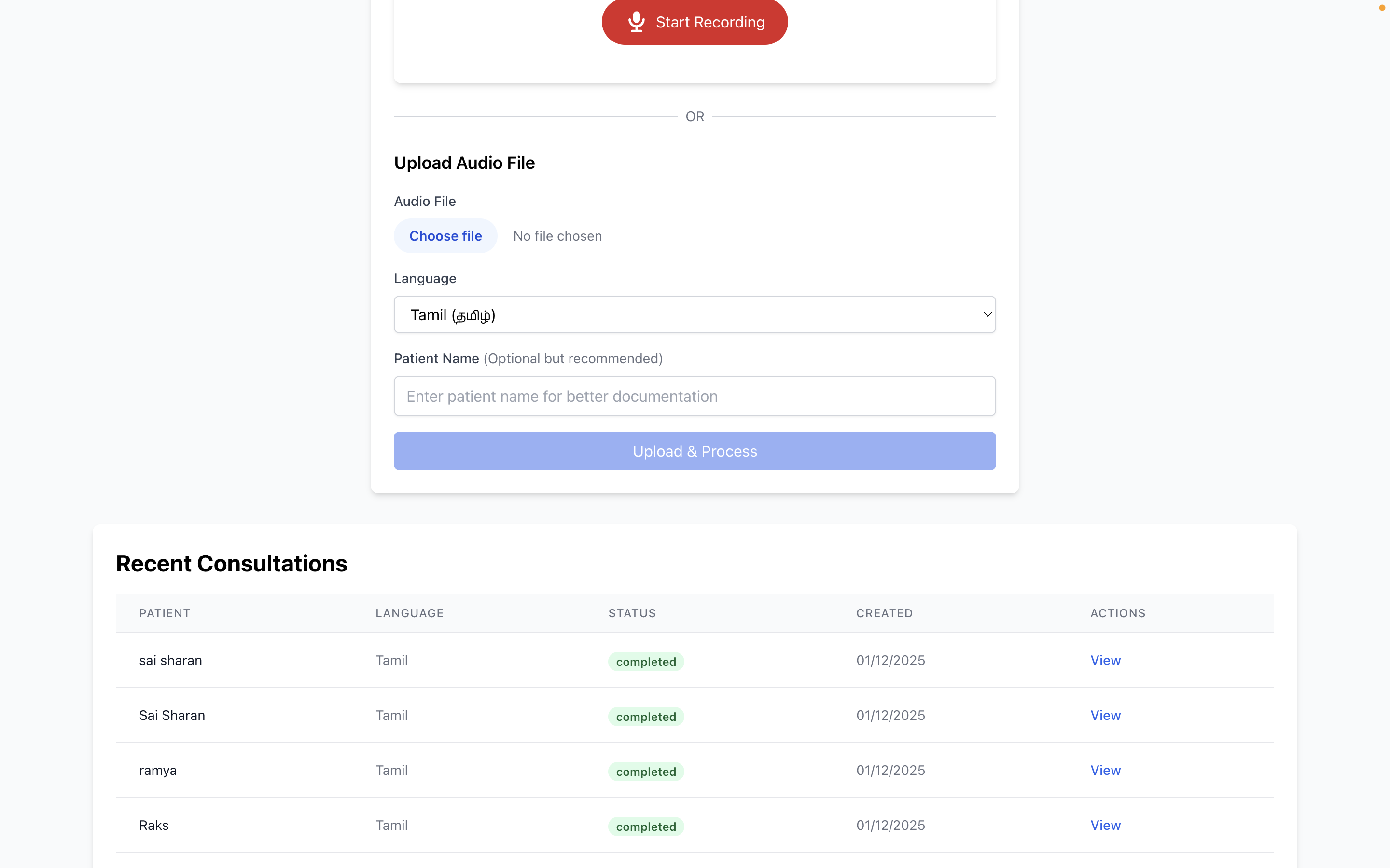 ## 概要 医療相談をAIでSOAPノート(主観・客観・評価・計画)へ自動変換。タミル語またはテルグ語での記録を英語の専門文書として即時作成し、事務作業時間を大幅に削減。ノートの最終化前には確認...
