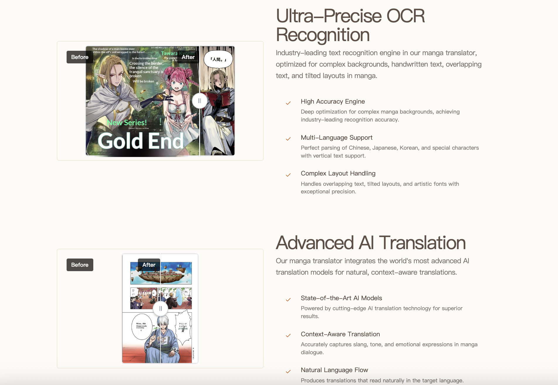 ##概要 AI搭載のマンガ翻訳ツール。50言語以上へ瞬時に翻訳、OCRと自動スタイル再現で原画の美しさを保ちながら画像上へ再配置します。日本語スキャン、韓国Webtoon、中国のManhuaなど...