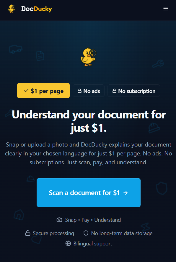 ## 概要 DocDuckyは、請求書・見積書・内訳といった書類を写真で撮るかアップロードするだけで、英語またはスペイン語で1ページあたり1ドルの料金で分かりやすく解説するノーサブスク型アプリで...