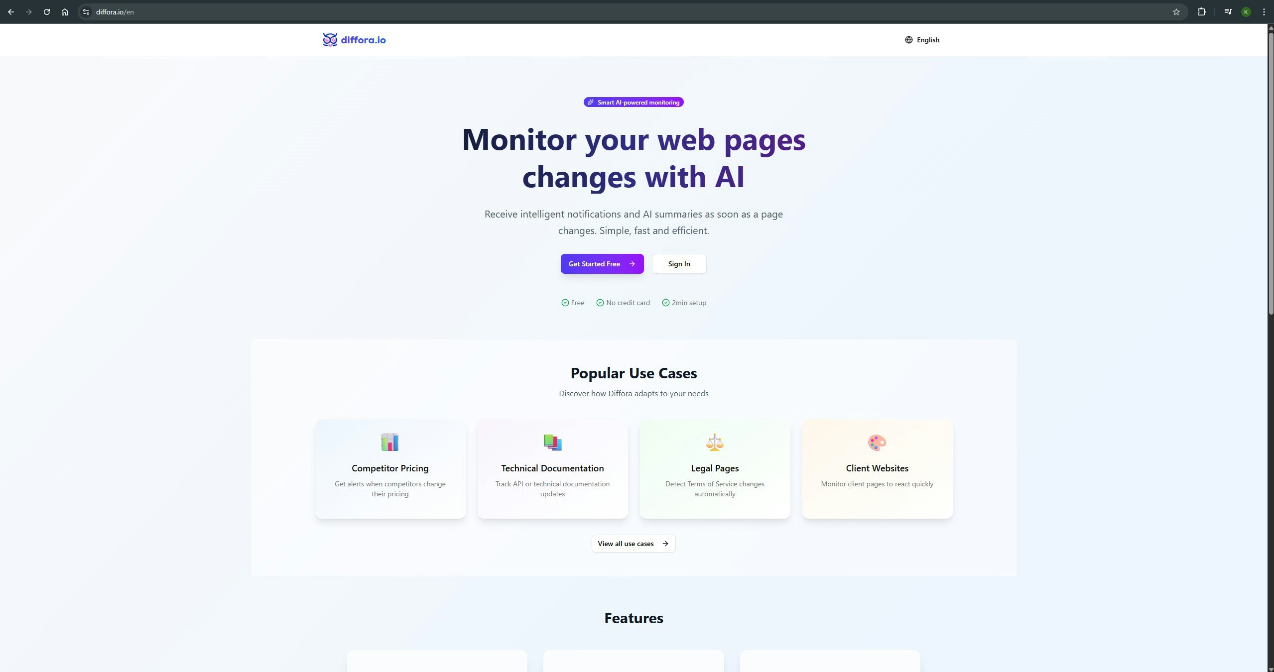 DifforaはHTML/JSのウェブページ更新を監視し、変化を検知するとAIで要約を自動生成する軽量ツールです。競合価格ページ、APIドキュメント、製品更新・変更履歴、法務・コンプライアンス関...