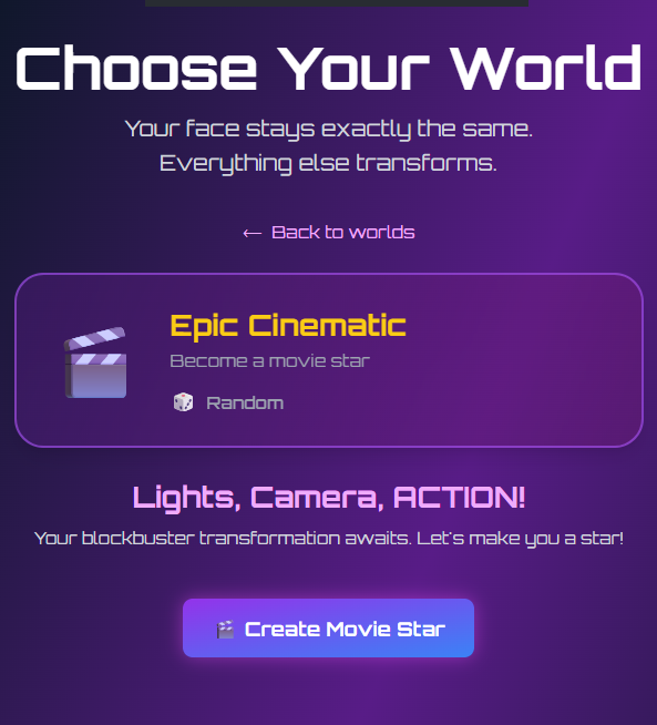 AIを活用して、1枚の自撮りから無限の世界観のAIパーソナリティへと再創造できるツール。ユーザーは『世界』を選ぶかダイスで決定し、顔周りの時代感・雰囲気・アートスタイルを変換しても、本人のアイデ...