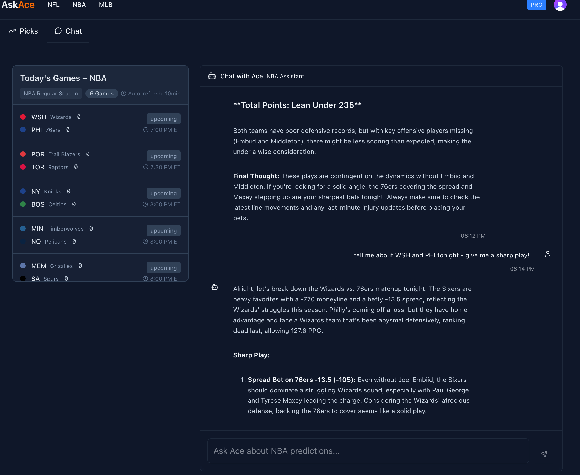 ## 概要 Ask Aceは、5年以上のデータに基づくAIスポーツ予測アシスタント。NFL・NBA・MLBのデイリーピックを平易な言葉で解説付きで提供します。1人で開発したシステムは、統計・オッ...