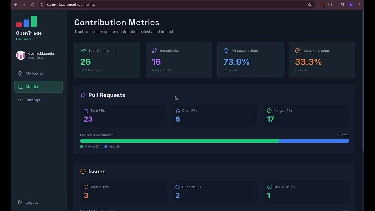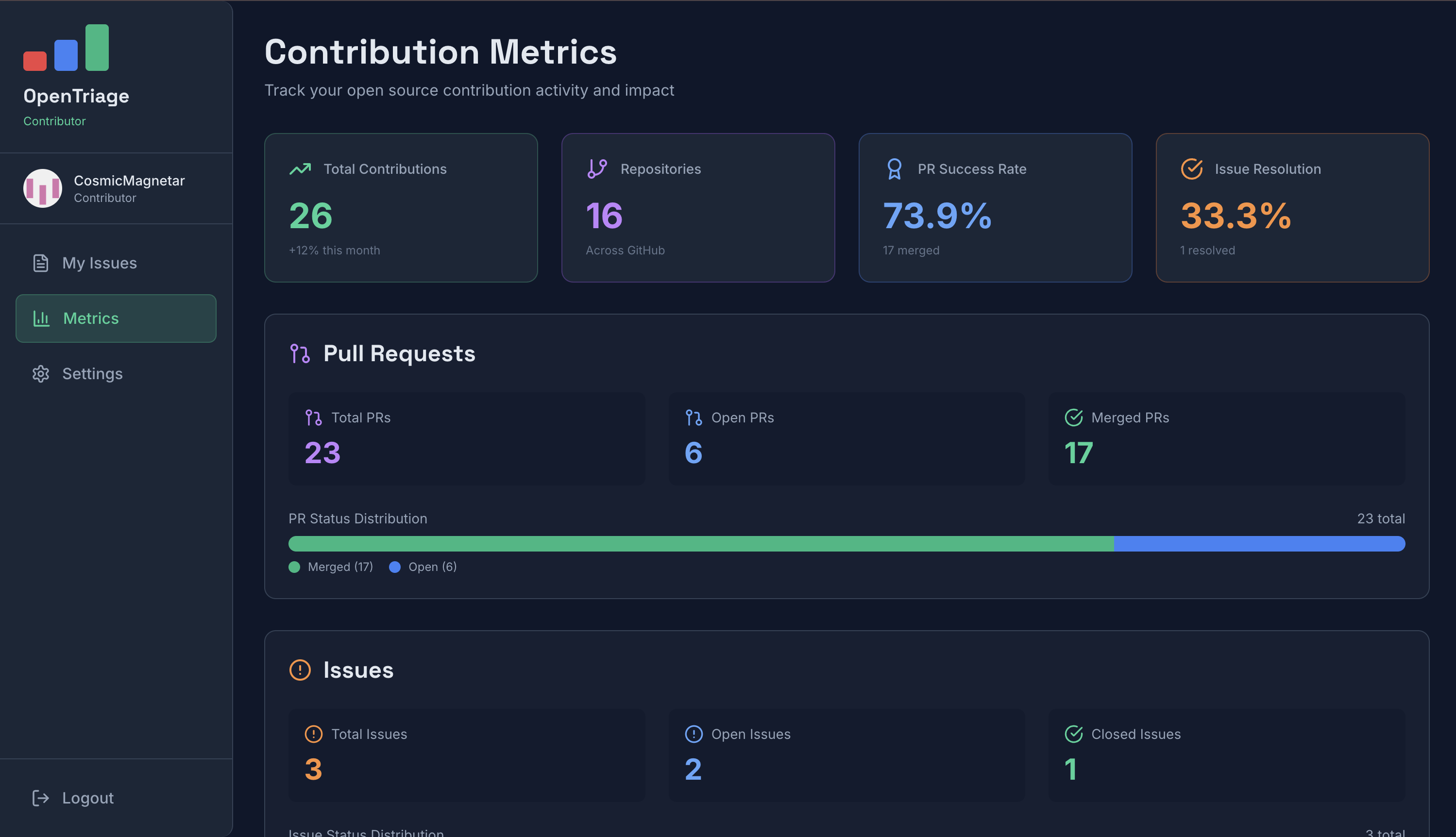 OpenTriageはGitHub Issues向けのAIダッシュボード。受信した課題を自動分類し、投稿者の感情を分析、文脈に応じた返信を下書きします。即時トリアージ、ワンクリック返信、寄稿者ビ...