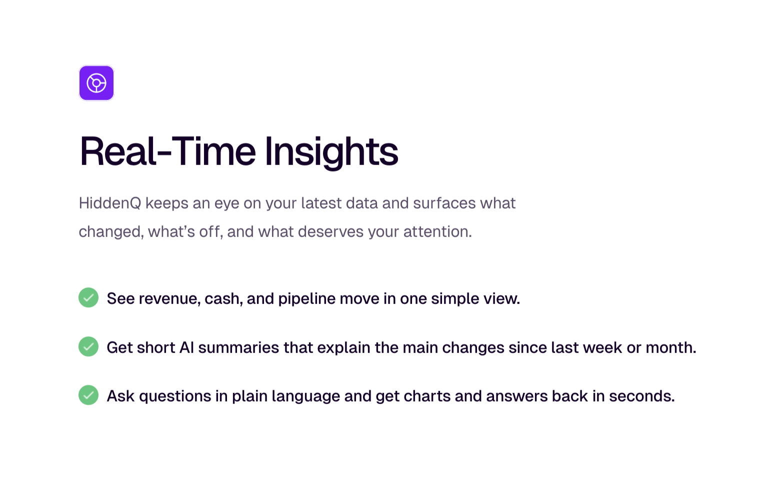 ## 概要 HiddenQは中小企業の経営層・財務リーダー・チーム向けのAIパフォーマンス・コックピット。データがツールやファイルに分散している状況を1つのワークスペースに統合し、収益・利益率・...