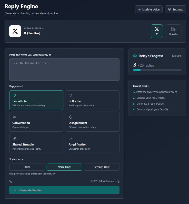 ## 概要 文脈を理解してブランドに合った返信を秒単位で生成するAI返信エンジン。X(旧Twitter)/LinkedIn でのエンゲージメントを労力をかけずに維持・向上します。 ## 特徴 ...