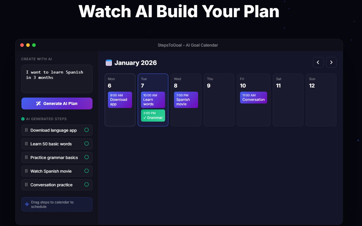 StepsToGoal の 2026 AI Goals Calendar は、AIを活用して大きな野心を日々の実行計画に落とし込み、段階的なロードマップを自動生成します。ドラッグ&ドロップでのタ...