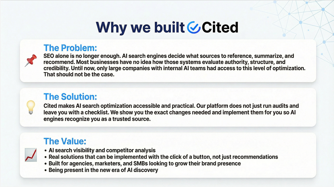 Citedは、AI検索で自社がAIの回答に選ばれるよう導くGEOプラットフォームです。高意図のクエリを特定し、ChatGPT・Claude・Perplexityなどへの露出を最適化、実際の引用を...