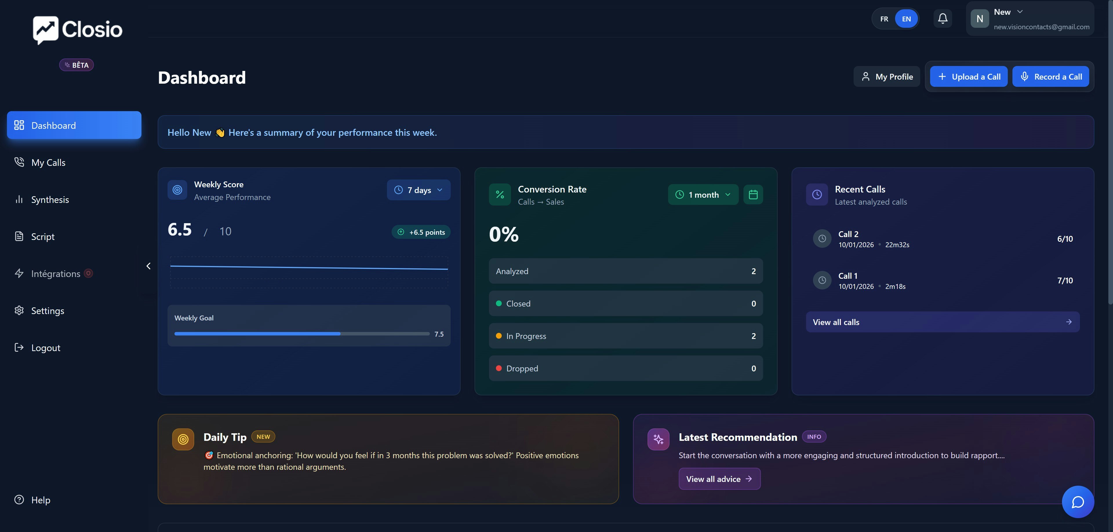 ##概要 Closioは準備・構造化・分析・改善を一体化したセールスコールの全体プラットフォーム。ライブ対話を含む商談を成約へ結びつけるため、継続的な改善をサポートします。 ##特徴 - 実デ...
