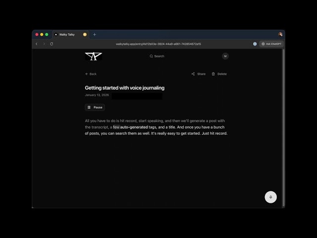 WalkyTalky.appは、日常の思考を音声で記録し、AIがタイトルとタグを自動生成、音声を文字起こしして読みやすいブログ風ページへ変換するボイスノートアプリです。最小の摩擦で使える設計と、...