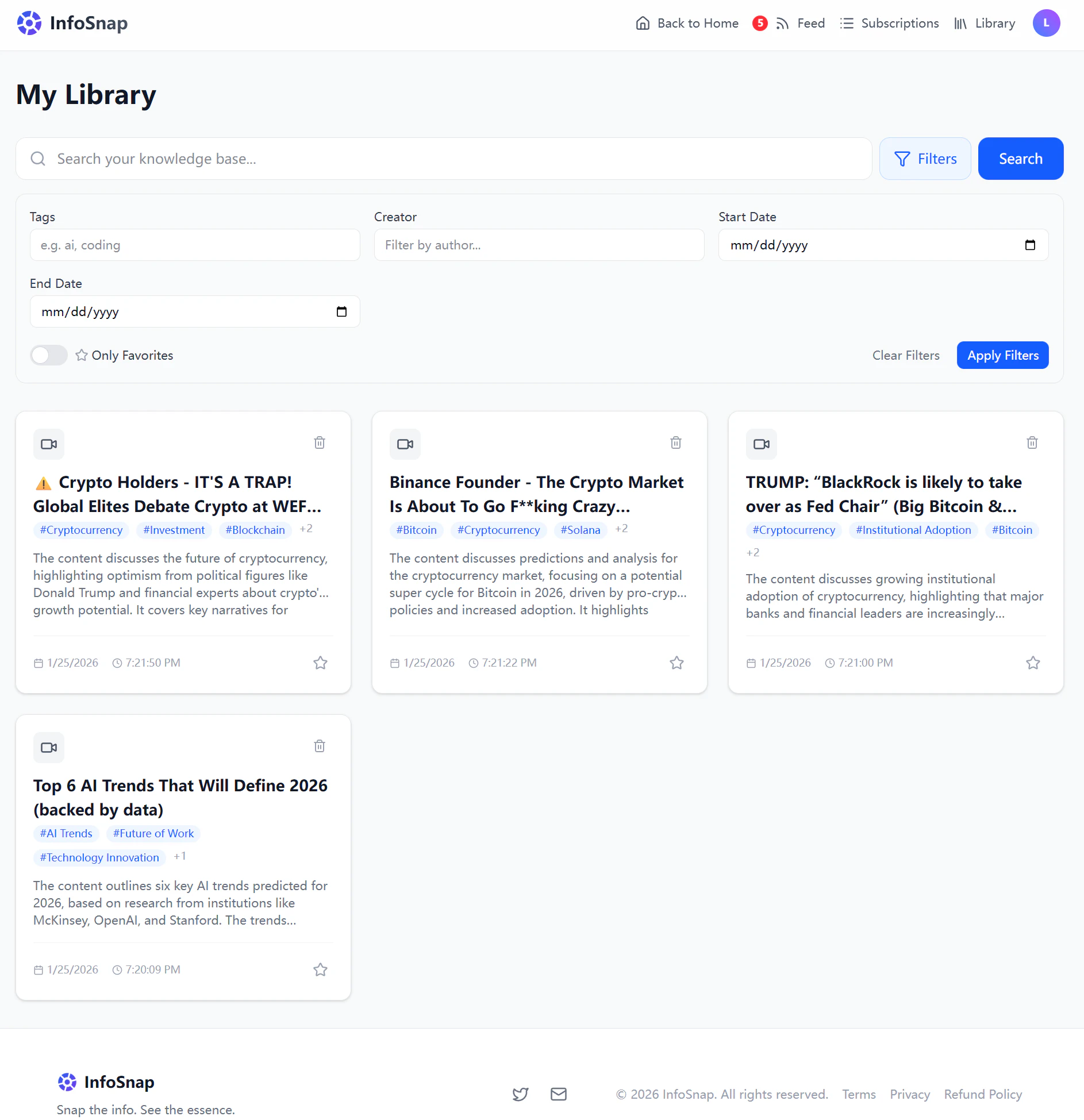 ## 概要 InfoSnapは、フォローしている動画・ポッドキャスト・記事を自動で追跡し、更新を要約して提示します。リンク単位で動く従来の要約ツールと違い、関心のあるクリエイターやブログを自動で...
