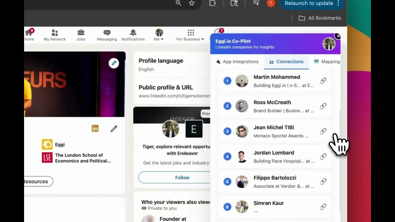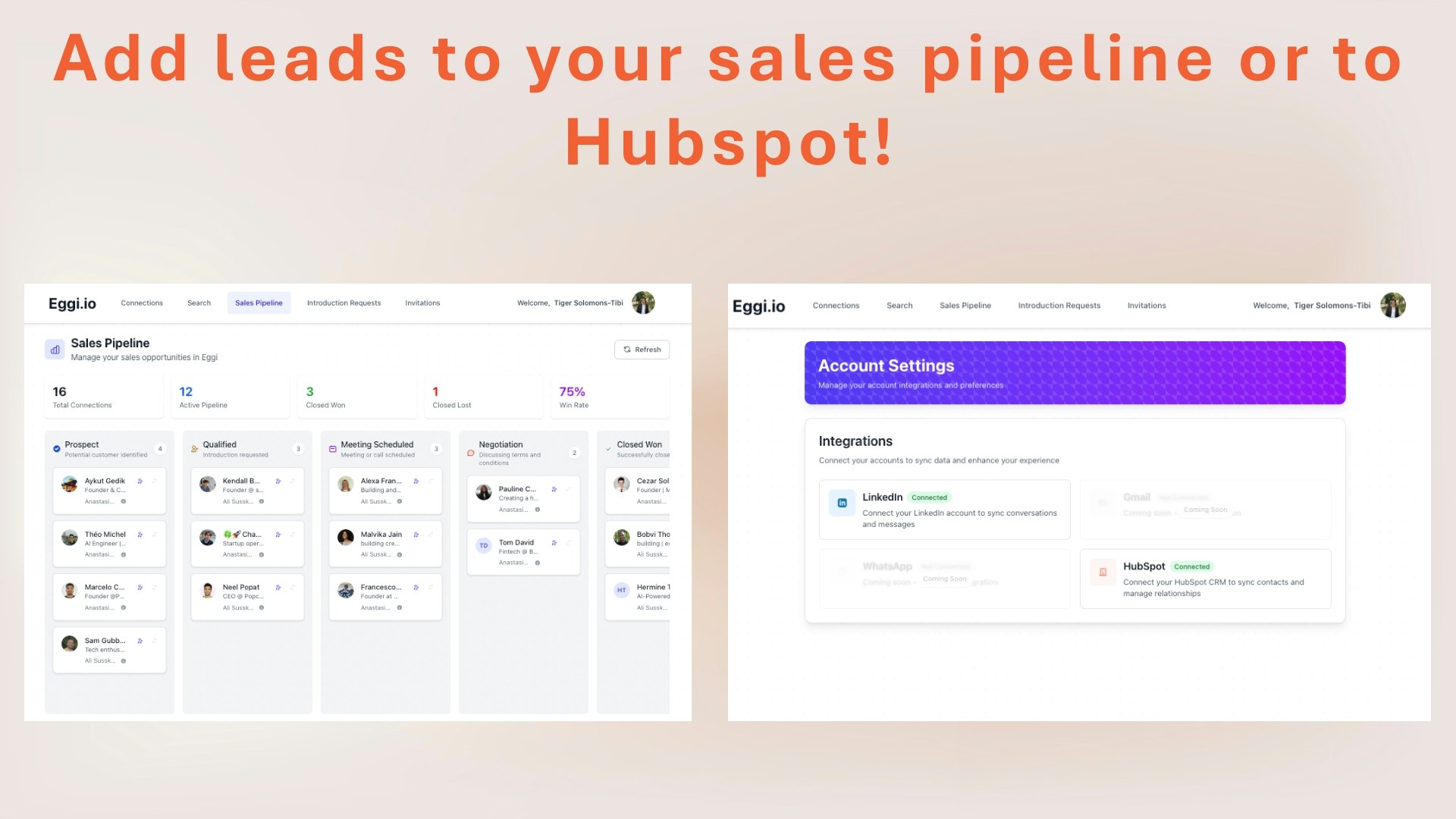 Eggi はネットワーク内のつながりを自動的に可視化し、友人・顧客・投資家・競合が誰を最もよく知っているかを示します。温かい紹介を自然に引き出し、CSVのアップロード不要で営業ワークフローに溶け...