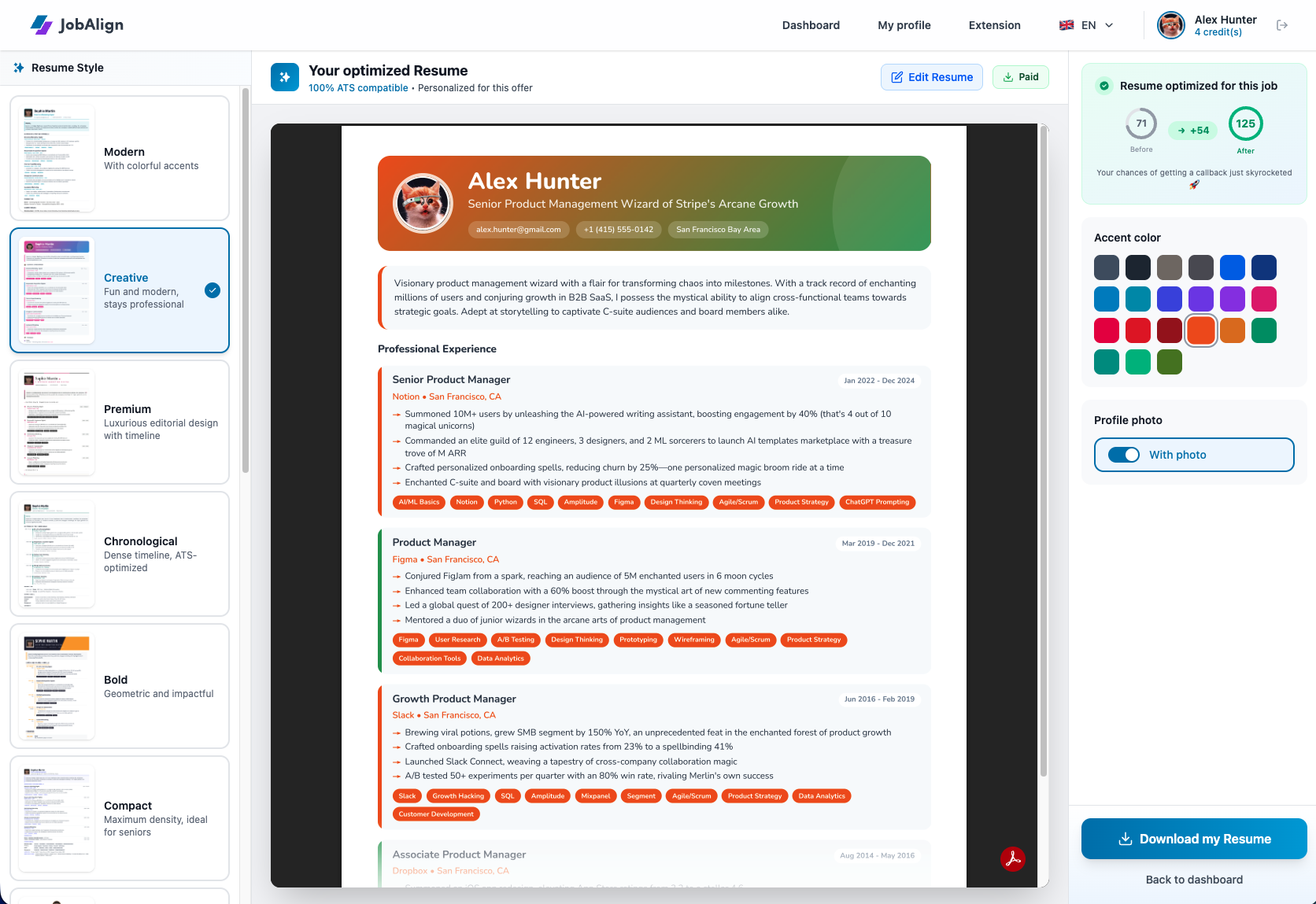 JobAlign は LinkedIn プロフィールと求人情報を組み合わせ、ATS対応済みの履歴書を数分で生成するウェブ拡張機能。マッチスコア表示とクリーンなテンプレート、複数ブラウザ8言語対応...