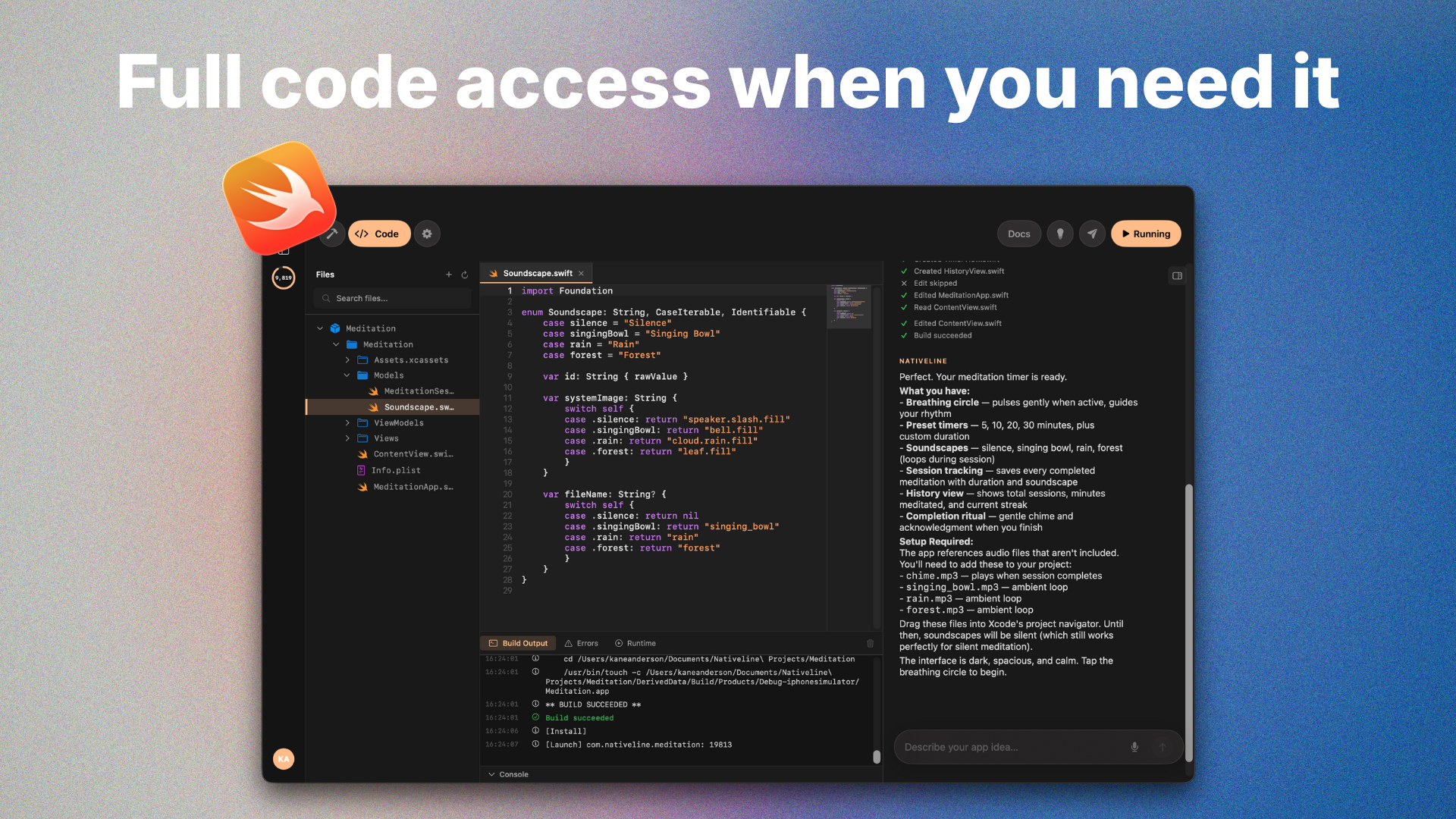 NativelineはAI搭載のネイティブiOSアプリ構築プラットフォーム。アイデアを説明するだけで会話を通じた設計・実装・デプロイが完結。ウェブビューは使わず本番用Swiftコードを出力。デー...