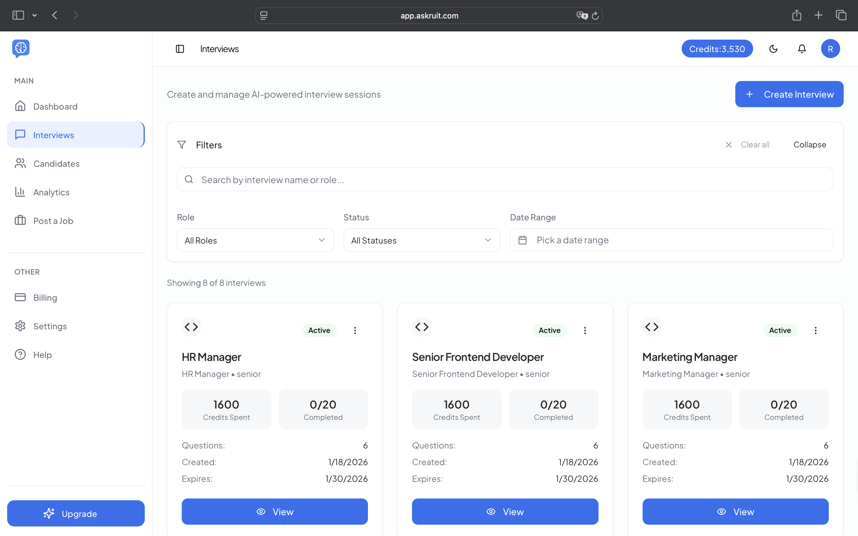 ##概要 Askruitは24/7対応のAI面接官。動的な対話により深い洞察とソフトスキルを評価し、評価はリードのショートリストとして人間の判断へ繋ぎます。 ##特徴 - 人間らしい対話で深掘...