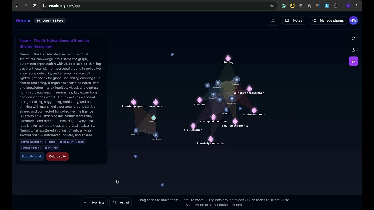 ## 概要 Neurixは散らばった情報を一元化し、“生きた”知識グラフとして活用するツールです。テキストを入力するとLLMが要点を要約・抽出し、ノードとキーをNodePool/KeyPoolに...