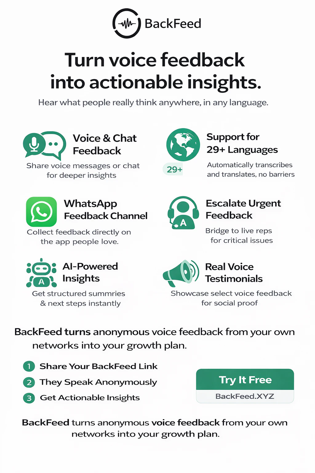## 製品概要 BackFeedは、会話中に同意を取った顧客の声を録音・文字起こしして、自然な称賛を信頼できる社会的証明へ変換します。匿名で収集でき、素の感情を保つままマーケティング資産に。Sa...