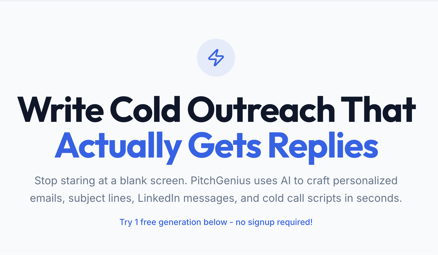 ## 概要 PitchGeniusはAI搭載のセールス自動化プラットフォーム。30秒で個別化されたコールドメール、件名、フォローアップ、LinkedInメッセージ、コールドコールのスクリプトを生...