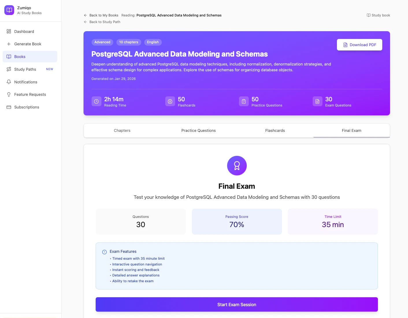 Zumiqoは、AIを活用して任意のトピックを実践的な学習カリキュラムへと自動変換します。章構成の学習プラン、フラッシュカードによる能動的リコール、練習問題、模擬試験を組み合わせ、長期記憶の定着...