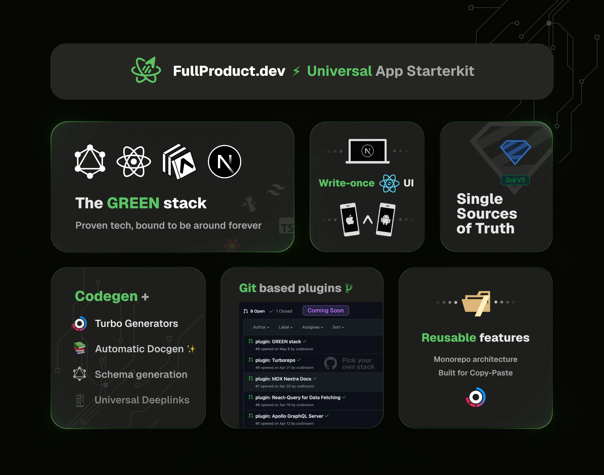 Web/モバイルを1つのコードベースから出荷できるユニバーサル開発基盤。Zodスキーマの型化・フォーム・DBモデル変換、自動MDXドキュメント、コピー&ペースト可能な機能、サーバーとクライアント...