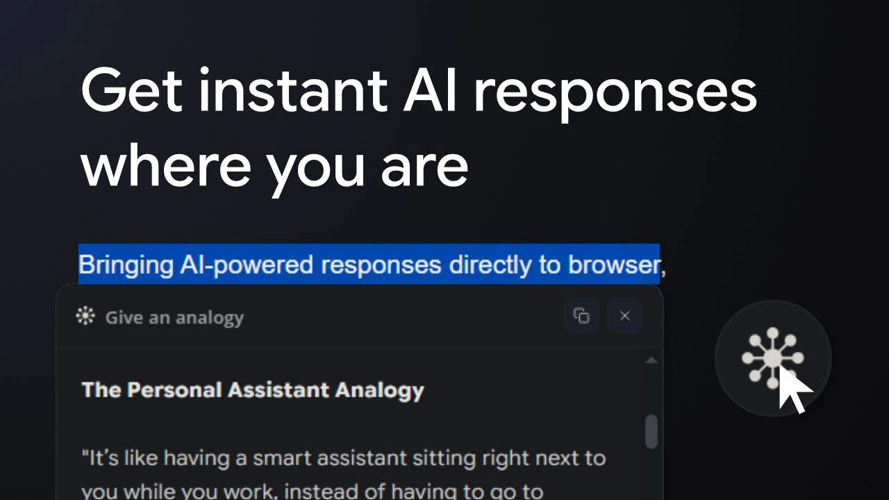 今いるページでAIの回答を得られるブラウザ体験。ウェブ上の任意のテキストを選択してボタンを押すだけで、コピー&ペーストの手間なく即座に要約・説明・翻訳などの回答を得られます。要約や説明、翻訳など...