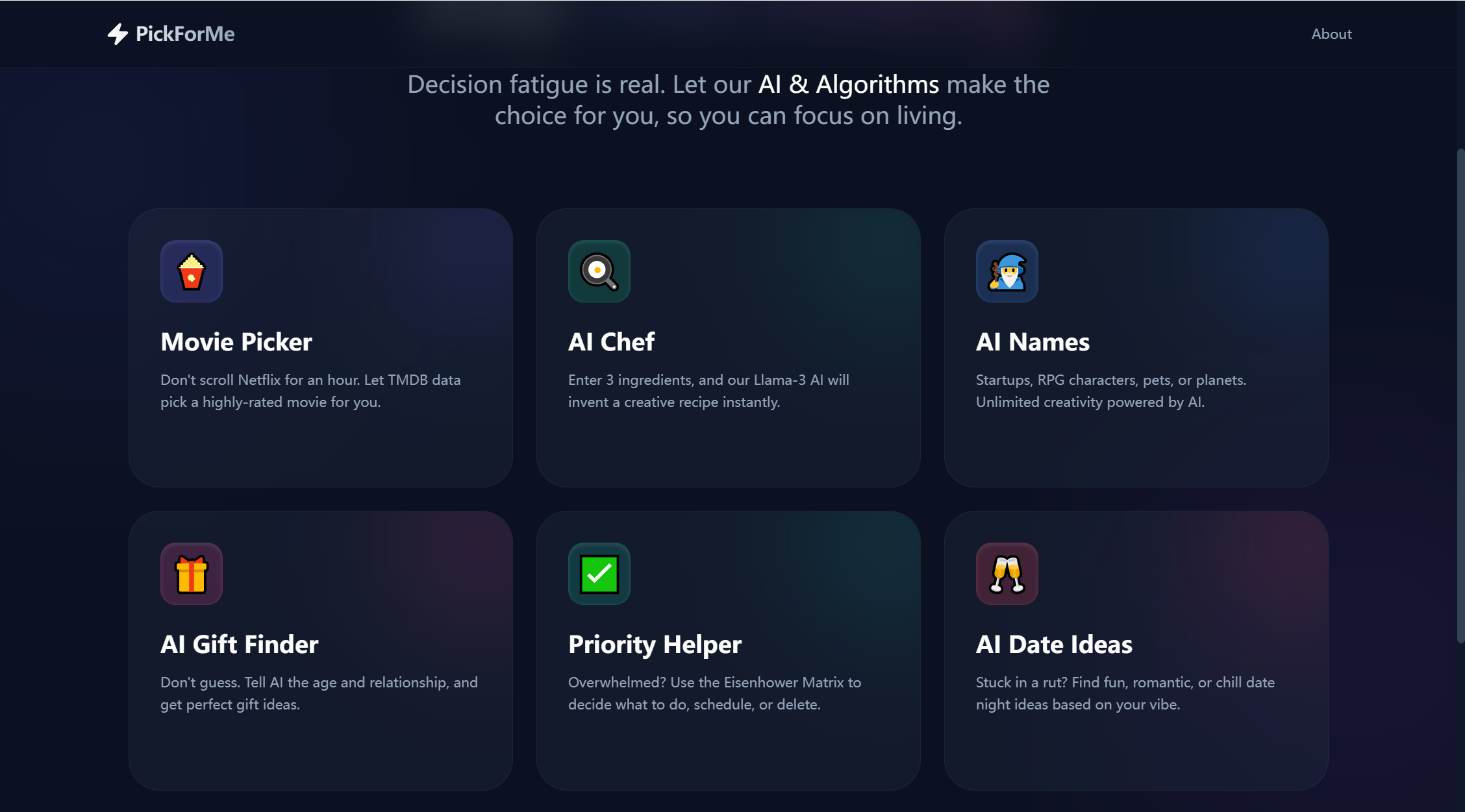 ## 概要 PickForMe.helpは、日常の小さな意思決定をAIに委任して決断疲れを軽減する無料ツール。映画選び・献立作成・ギフト選びなどのミニ決定をサポートします。 - 主な機能: 映画...