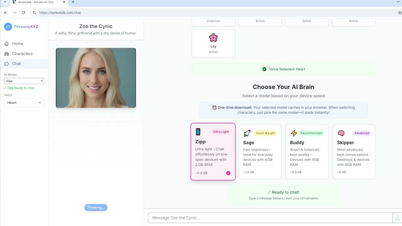 VertexTalkは、アバター付きのプライベートなブラウザベースAIチャットです。すべての処理がデバイス上でローカルに実行され、アカウント・サーバー・追跡なし。安全で楽しい自然な会話を提供しま...