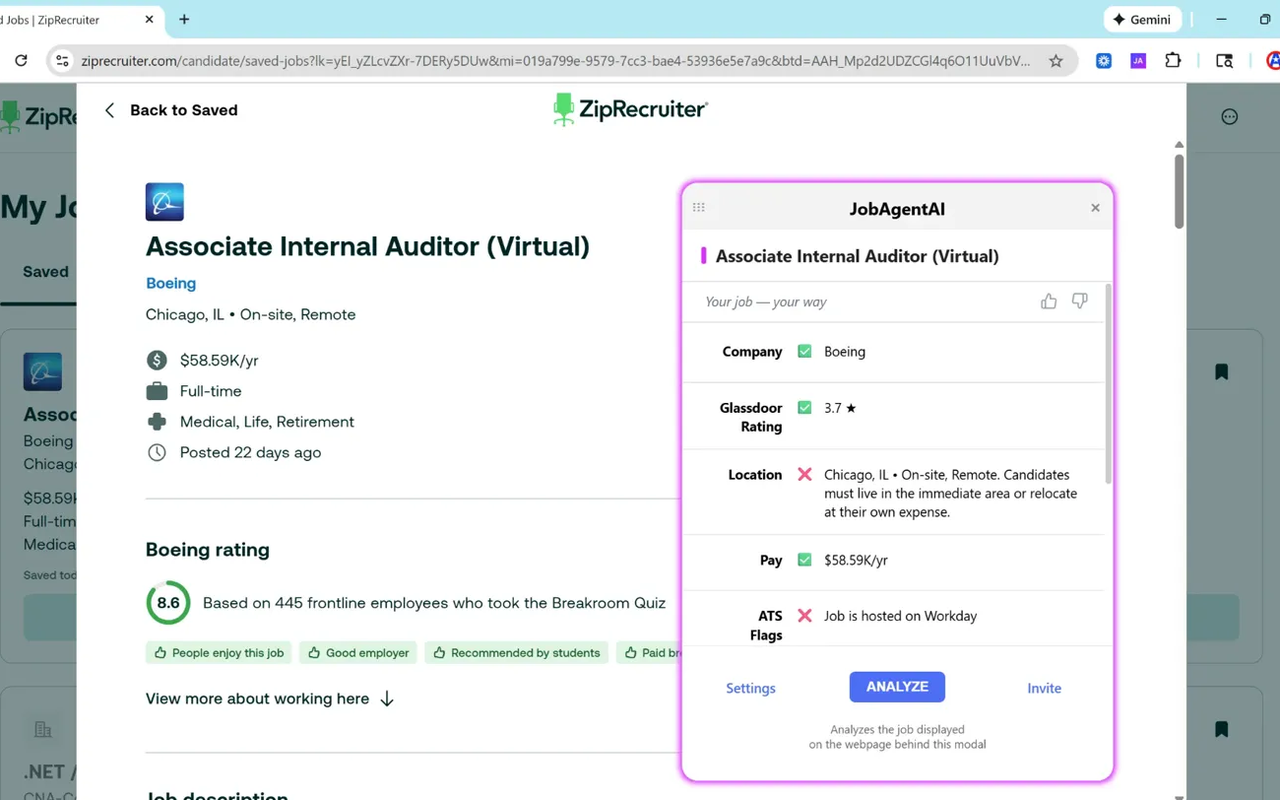 JobAgentAIは、求人応募を効率化するChrome拡張機能。LinkedIn・Indeed・Glassdoorをはじめとする15サイト以上で動作し、求人を事前にスクリーニングして良い求人だ...