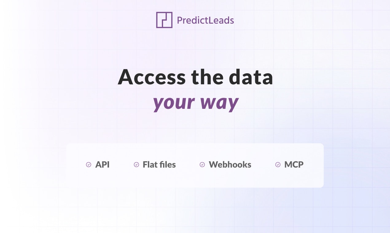 PredictLeadsのTechnographicsデータセットは、企業が使用している技術を信頼できる構造化データとして提供します。出典はウェブサイト、求人情報、DNSレコード、IPレンジ、ク...