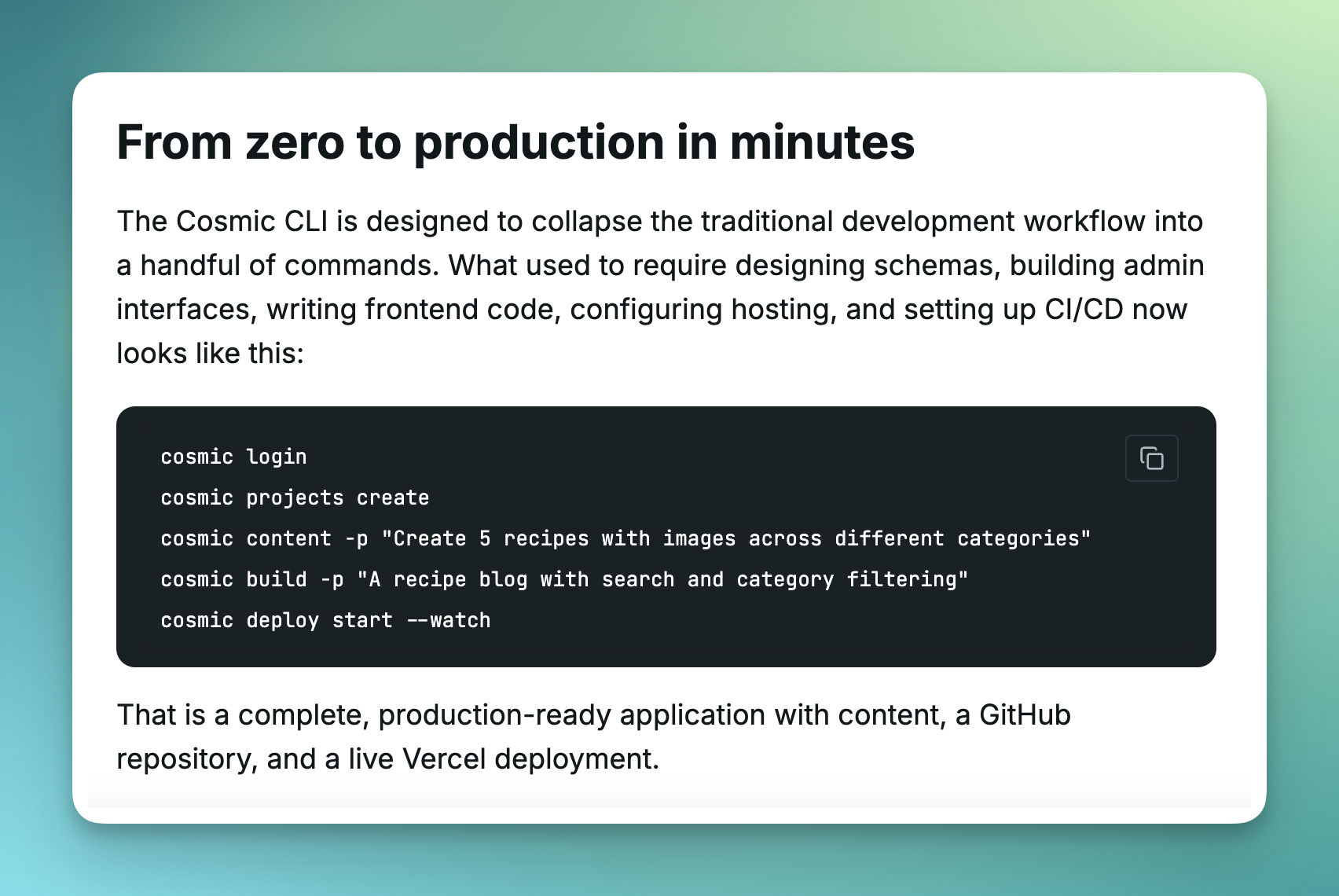 ## 概要 Cosmic CLIは、AI搭載のCLIでCosmicプラットフォームを端末に持ち込みます。対話型シェル、AIチャット、ワークフローのショートカットを備え、アイデアを説明すると生成・...