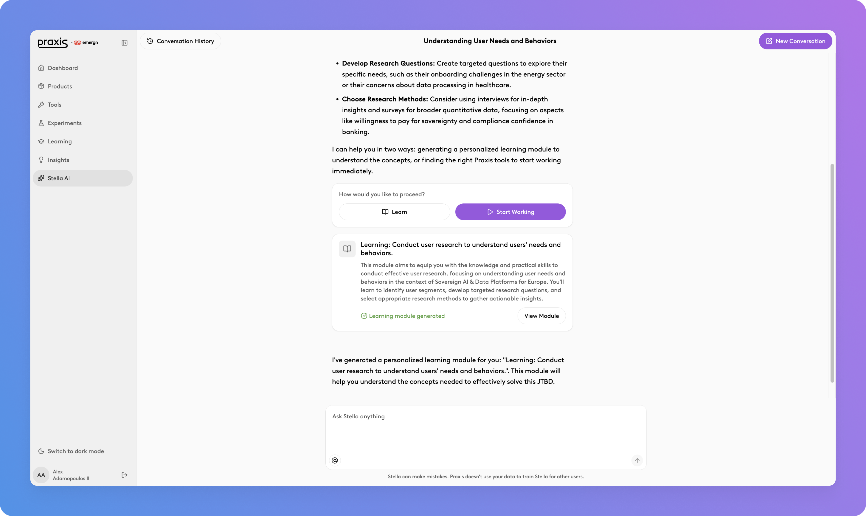 ## 概要 Praxis はAI搭載のワークスペースで、戦略定義・探索実行・納品計画を一元管理します。Stella は長年の独自データで訓練された AI コーチとして、初期段階のチームにも熟練ビ...