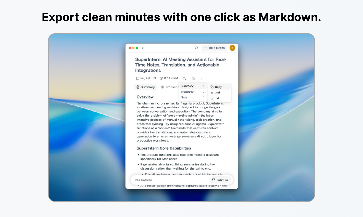 ## 概要 - ボットなしのミーティングアシスタント。システムオーディオをキャプチャしてZoom/Meet/Slackなどで動作。会議中はリアルタイムの要約と字幕を小さなオーバーレイで表示。話者...