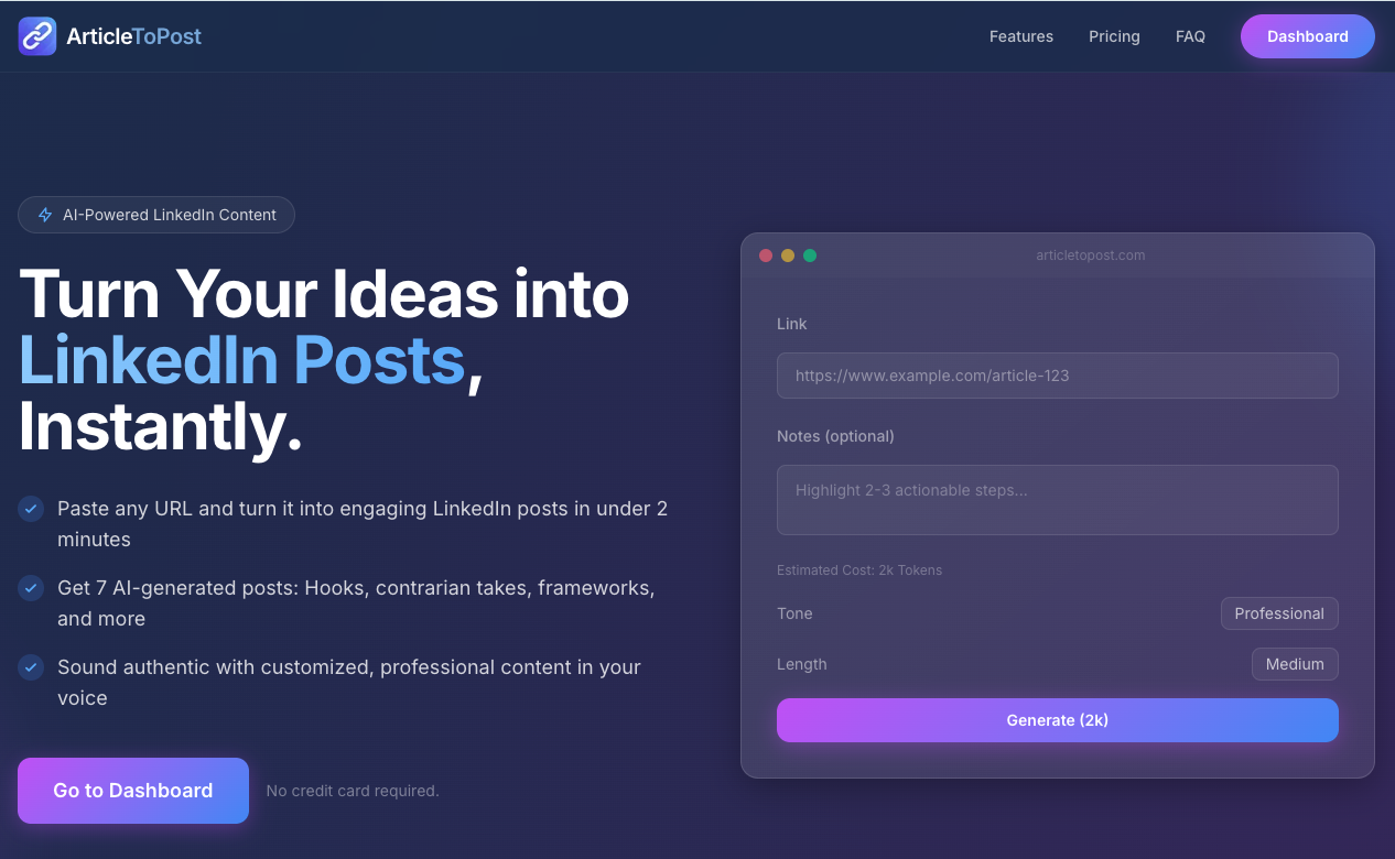 アイデアやURLを瞬時にLinkedIn投稿へ変換するツール。URLを貼るだけで2分未満で魅力的な投稿を作成。7種のAI生成投稿(フック、異論、フレームワーク、ストーリー、リストなど)を提供。自...