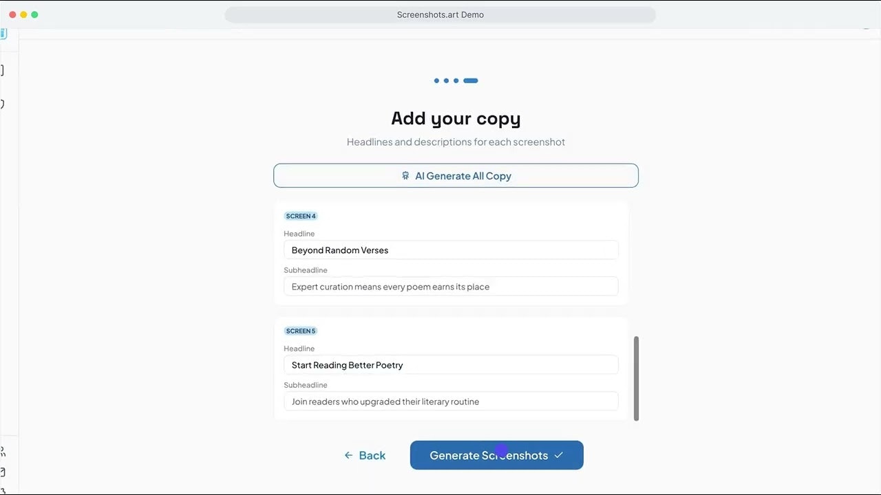 AIを使って数分でApp StoreとPlayストア向けのスクリーンショットを自動生成するSaaS。デバイス枠・背景・販促文を組み合わせ、プロ品質を実現。リデザイン版のキャッチコピーにも対応。手...
