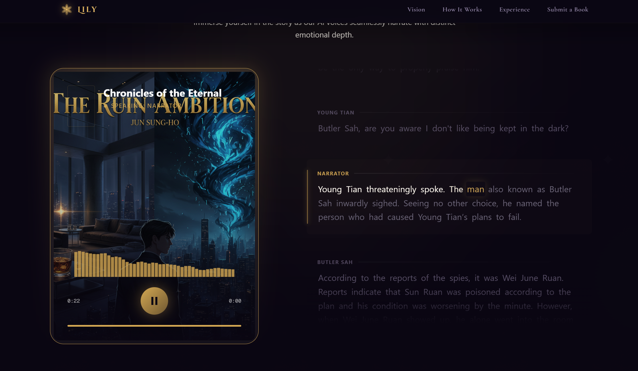 LilyはAI搭載のシネマティックなオーディオブックエンジンです。テキストを分析して話者を識別し、場面のムードに合わせたキャスト声を自動で割り当て、背景音で雰囲気を強化します。リアルタイムで静的...