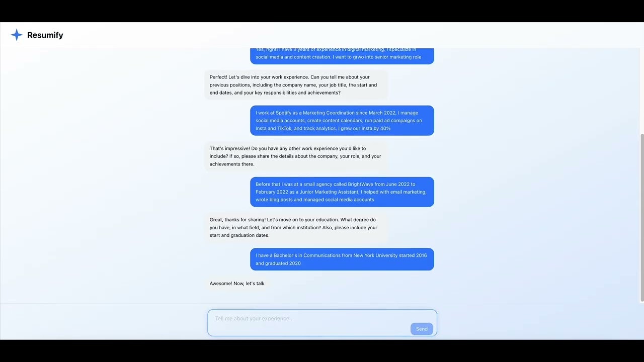 ##概要 - AIと対話して履歴書を作成 - フォーム入力を削減、経験についての会話から適切なフォローアップ質問で言語を整え、ATS対応の履歴書を約15分で生成 - プレビューは無料、PDFは$...