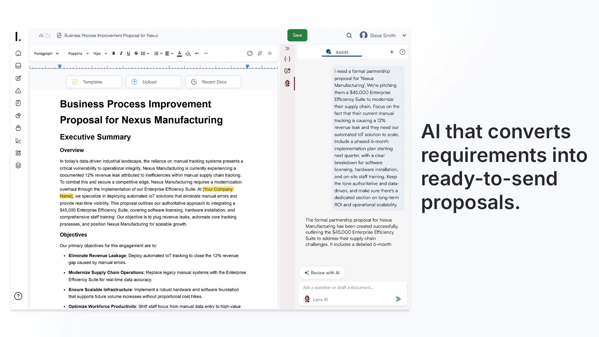 ## 概要 Proposal Generatorは Lanaと対話するだけで、構造化されたプロフェッショナルな提案書を作成します。機会の説明、範囲、価格、納品物、タイムラインを伝えると、意図を理...
